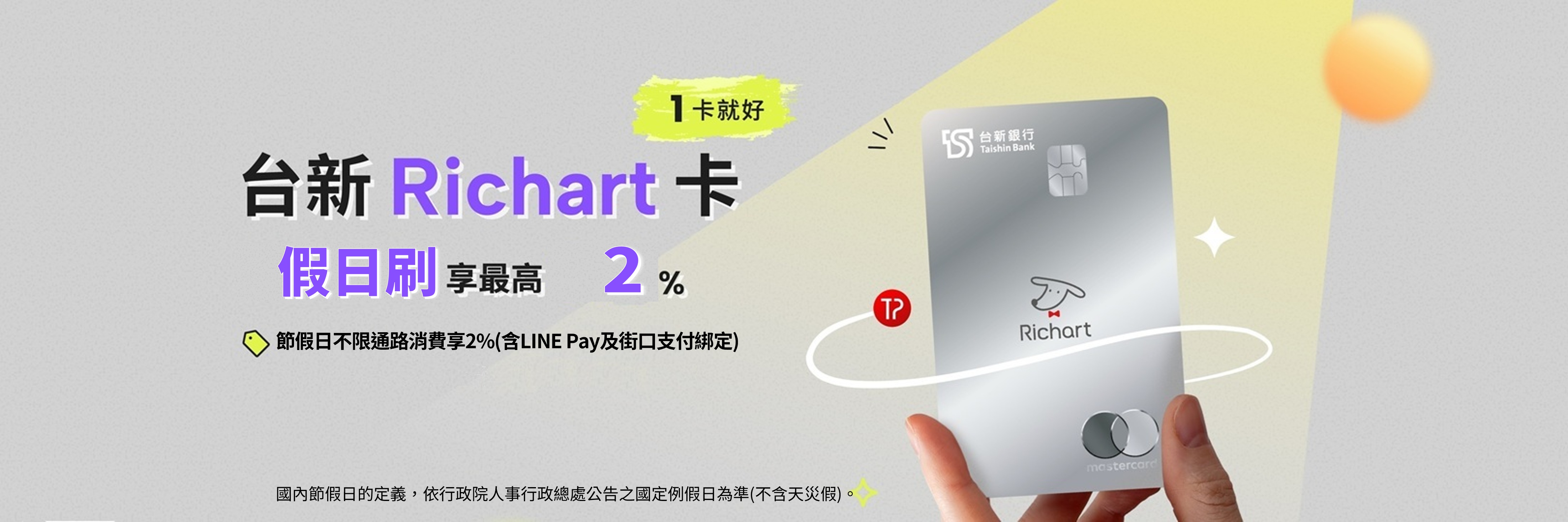 台新 Richart 卡「假日刷」,國內節假日享最高 2% 回饋 活動期間 2025/09/01 – 2025/12/31 活動說明 👉 詳 台新Richart卡網頁 👉 點我 查看如何使用 Richart Life App 進行切換 👉 立即申辦 台新Richart卡