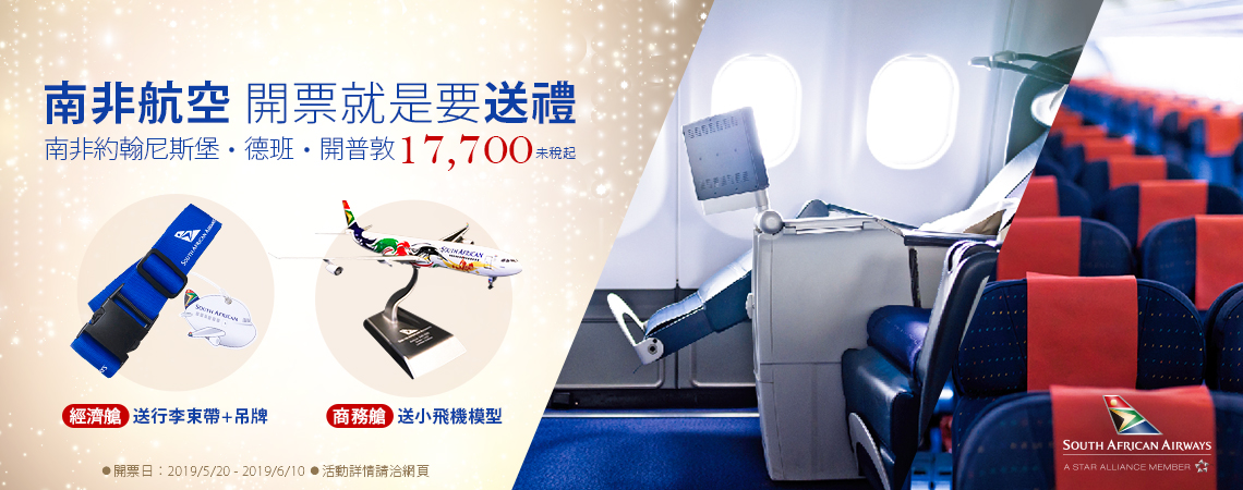 - 活動說明:凡於活動期間於易飛網下單並開立SA南非航空之機票(083),贈送南非航空行李束帶及吊牌,商務艙則是送小飛機模型。